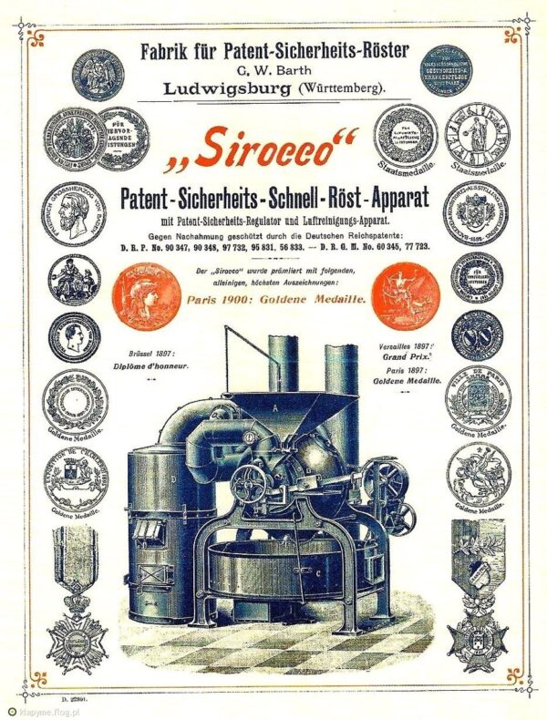 In 1890, A. Mottant, Bar-le-Duc, France, began to manufacture a line of coffee-roasting machinery which included vertical ball-and-cylinder machines, using wood, coal, coke, or gas for fuel. His best known makes were the Magic and Sirocco.