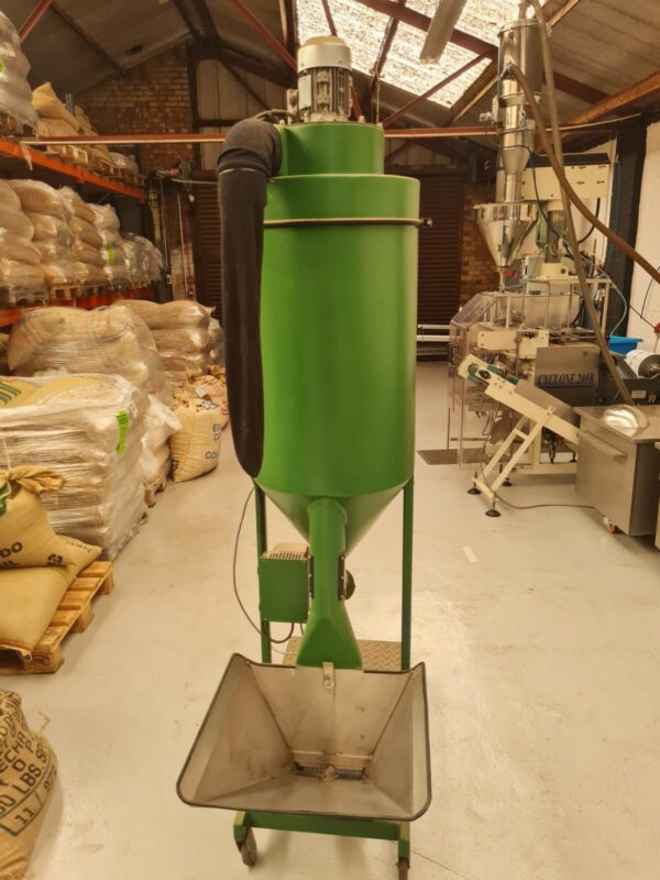 This is designed to run with a Giesen W15 roaster and has a 50Kg capacity, so only needs emptying after every three roasts.
