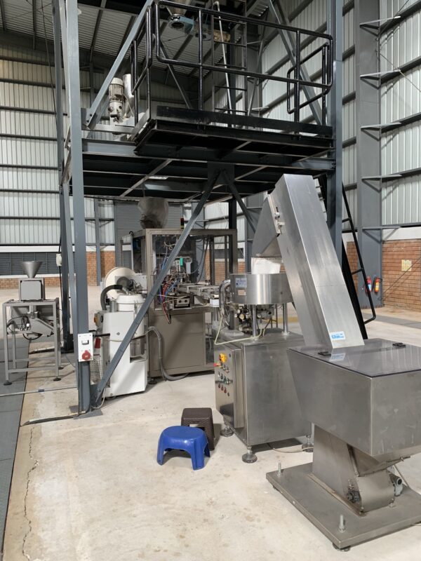 This is a single lane capsule filling and sealing machine with integrated Colibri packing machine set-up to pack single capsules into a form fill and seal pillow- pack bag. It can also pack two capsules into each bag if required.