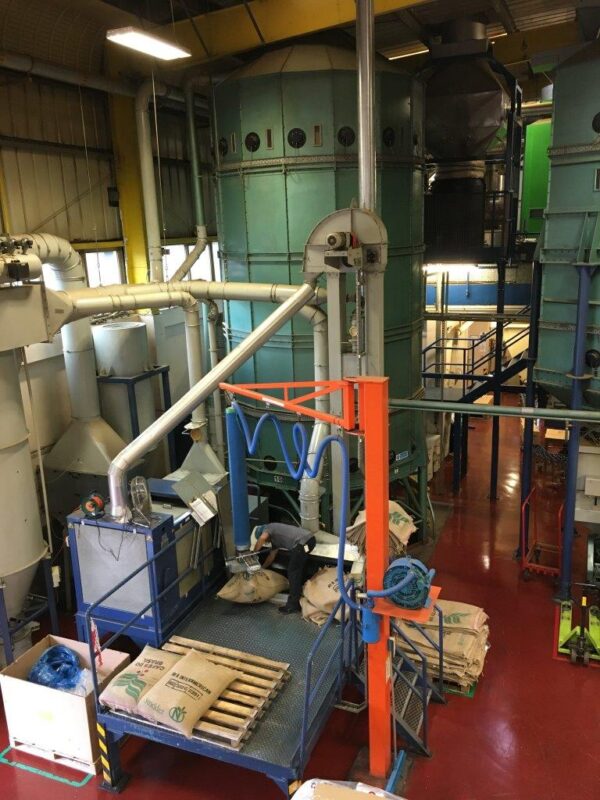 Green bean Sacks lifted via suction device for loading into infeed Hopper. Beans then transported through destoner and metal detection before being vacuum transferred into Green bean Silos for storage.