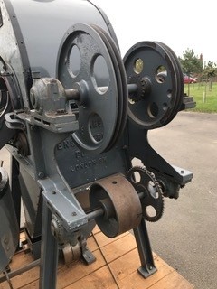 It has no belts or chains, but does come with the original burner and gas train and also a lever for turning the cooling tray arms on and off.