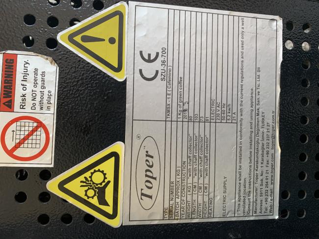 2013This is an electrically heated coffee roaster set-up to run on 230V Single Phase power, 50-60Hz, 5.2kW/Hr, 21Amps